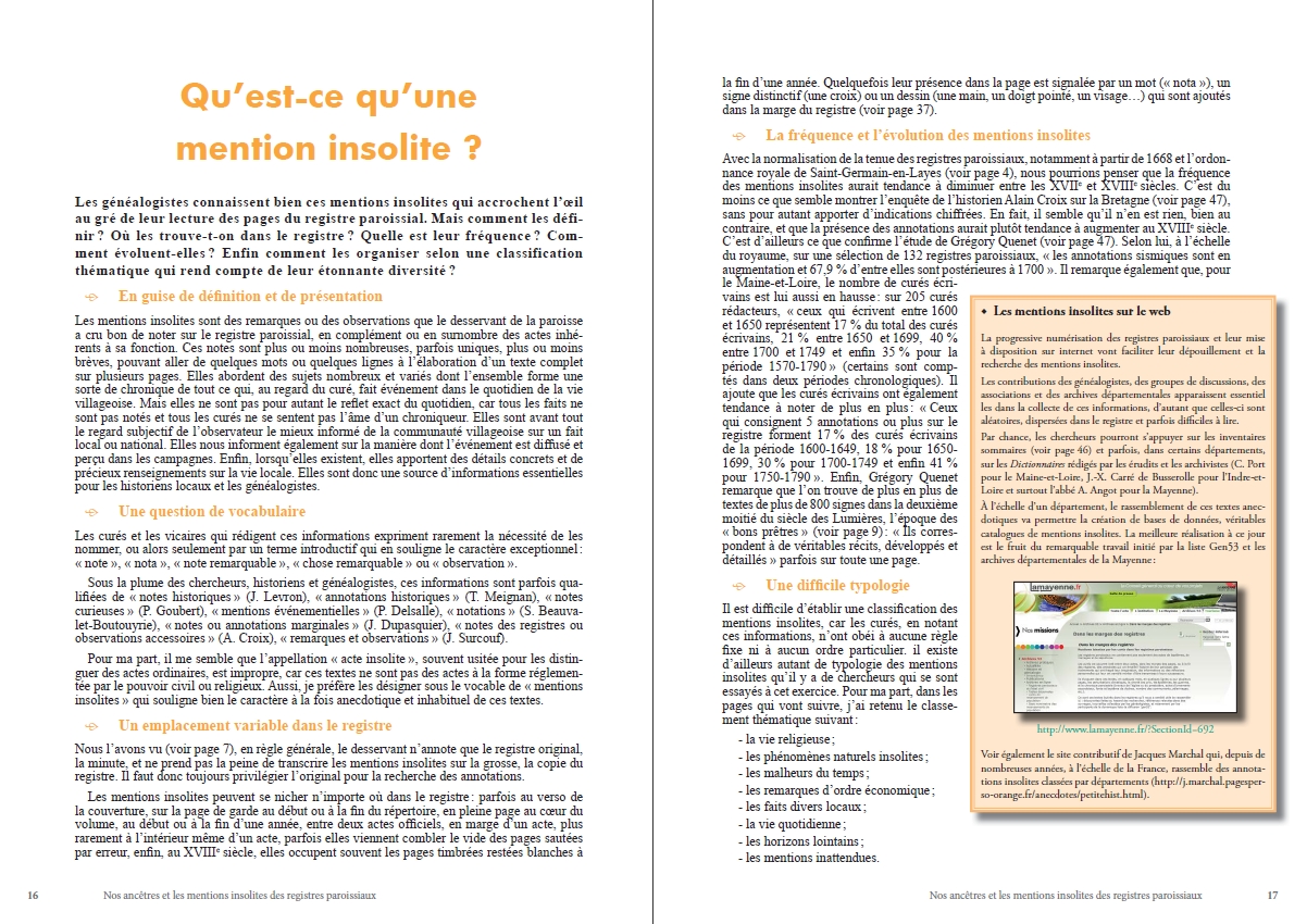 Avec cet ouvrage, je vous propose une étude générale de ce type de textes, une sélection de mentions insolites classées en chapitres thématiques, mais surtout j’espère partager avec vous ma curiosité pour ces anecdotes et vous donner envie de les étudier et les commenter pour compléter votre généalogie, l’histoire de votre famille ou de votre commune.